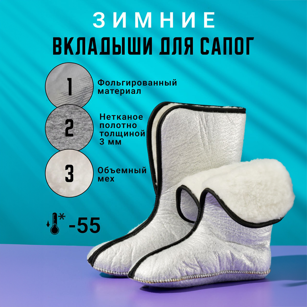 У вас есть прекрасная возможность приобрести фольгированный сменный утеплитель для сапог! Вкладыш-утеплитель обеспечит надежную защиту от холода и создаст комфортную атмосферу в вашей обуви. Сапоги больше не будут вызывать дискомфорт в прохладную погоду. Вкладыши можно использовать в качестве домашней обуви в плохо отапливаемых и неотапливаемых помещениях, домах и дачах, постройках с холодным полом. Термовкладыши являются идеальным решением для тех, кто хочет сохранить тепло своих ног в обуви. Наши валенки созданы специально как вкладыш-чулок в резиновую обувь. Благодаря своей фольгированной структуре, они замечательно сохраняют тепло и защищают от пониженных температур. Внутренний чулок вкладыш в сапог под брендом "Колесник" имеет следующую структуру: первый слой фольгированный материал, второй слой нетканое полотно толщиной 3 мм, третий слой - объемный мех. Меховой слой имеет основу из 100 % хлопка, состав меховых волокон: 40 % натуральная шерсть, 60 % искусственное волокно. Вкладыши для обуви из такого материала сохраняют тепло при температуре -55 С. С помощью этого сменного утеплителя вы сможете наслаждаться каждой прогулкой в любую погоду. Он отлично подойдет для использования в зимний сезон или в прохладные весенние и осенние дни. Ваша обувь будет оставаться теплой и уютной. Такой вкладыш-утеплитель – незаменимый аксессуар для всех любителей активного отдыха и прогулок на свежем воздухе. Он обеспечивает полную свободу движения и комфорт при ходьбе. Подарите своим ногам заботу и уют с нашим фольгированным сменным утеплителем для сапог! Вкладыши для резиновых сапог и зимней обуви защитят от холода во время зимней рыбалки и охоты. Теплый меховой вкладыш для обуви - это отличный подарок для любителей охоты и рыбалки. Вставка в обувь заменит носки теплые мужские зимние. Вкладыши в сапоги подойдут для мужчин, для женщин, подросткам, также в наличии большие размеры.